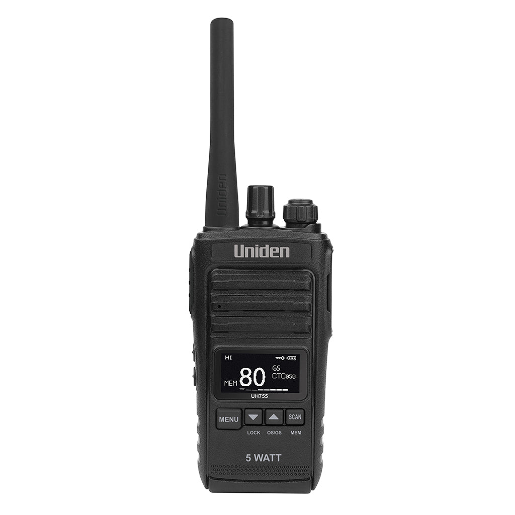 The UH755 UHFCB handheld radio is a solid 5 Watt power UHF radio that can deliver up to 17km# of range. This makes it the perfect unit for professionals who need a rugged and heavy duty radio suitable for various conditions. The UH755 features a splashproof design making it flexible to operate in many environments. The Backlit LCD Dot Matrix Display makes it easy to see in both night and day. The UH755 series can communicate up to a 17km range allowing users to stay connected on their next adventure even in the most remote locations without mobile reception. The Shared Channel Quiet Filter ensures the radio stays quiet when sharing a busy channel, only allowing transmissions from radios using the same code. With the finest components, unique engineering and styling, the UH755 offers outstanding performance adaptable in various conditions and situations, just what you expect from Uniden.